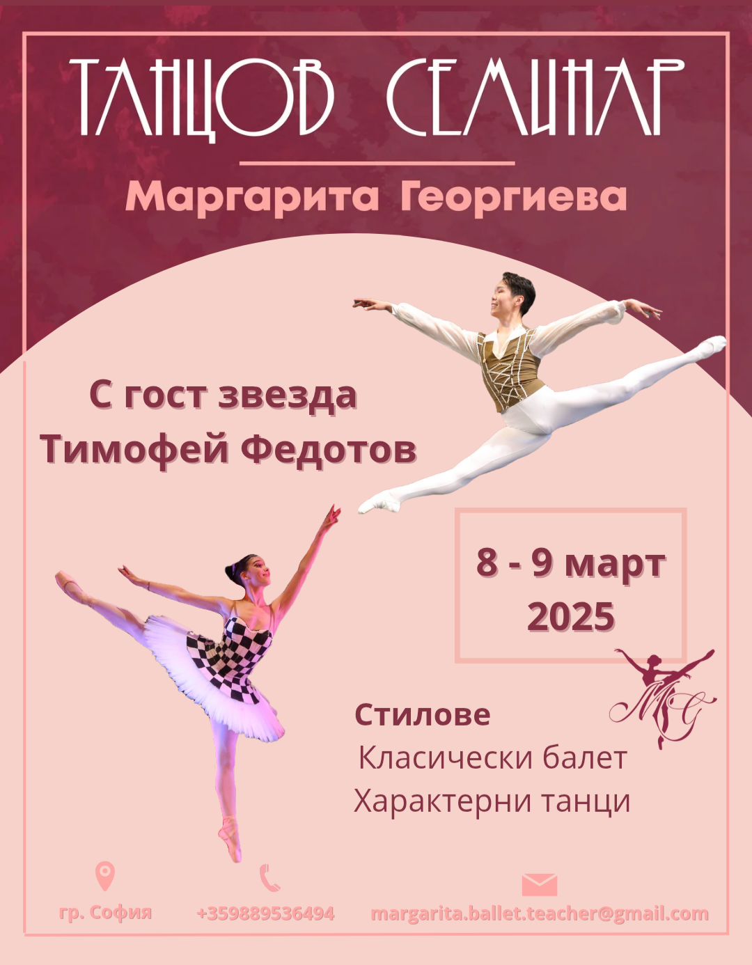 На 8 и 9 март ще се проведе танцовият семинар, включващ класове по класически балет, характерни танци и репертоар. За първи път в България заслуженият артист на Русия - Тимофей Федотов ще води класовете по класически балет и репертоар. С изключителния си опит, като балетист, лауреат на международни конкурси и студент по педагогика в Държавна балетна академия Ваганова, Федотов ще предаде знанията си тук в България.