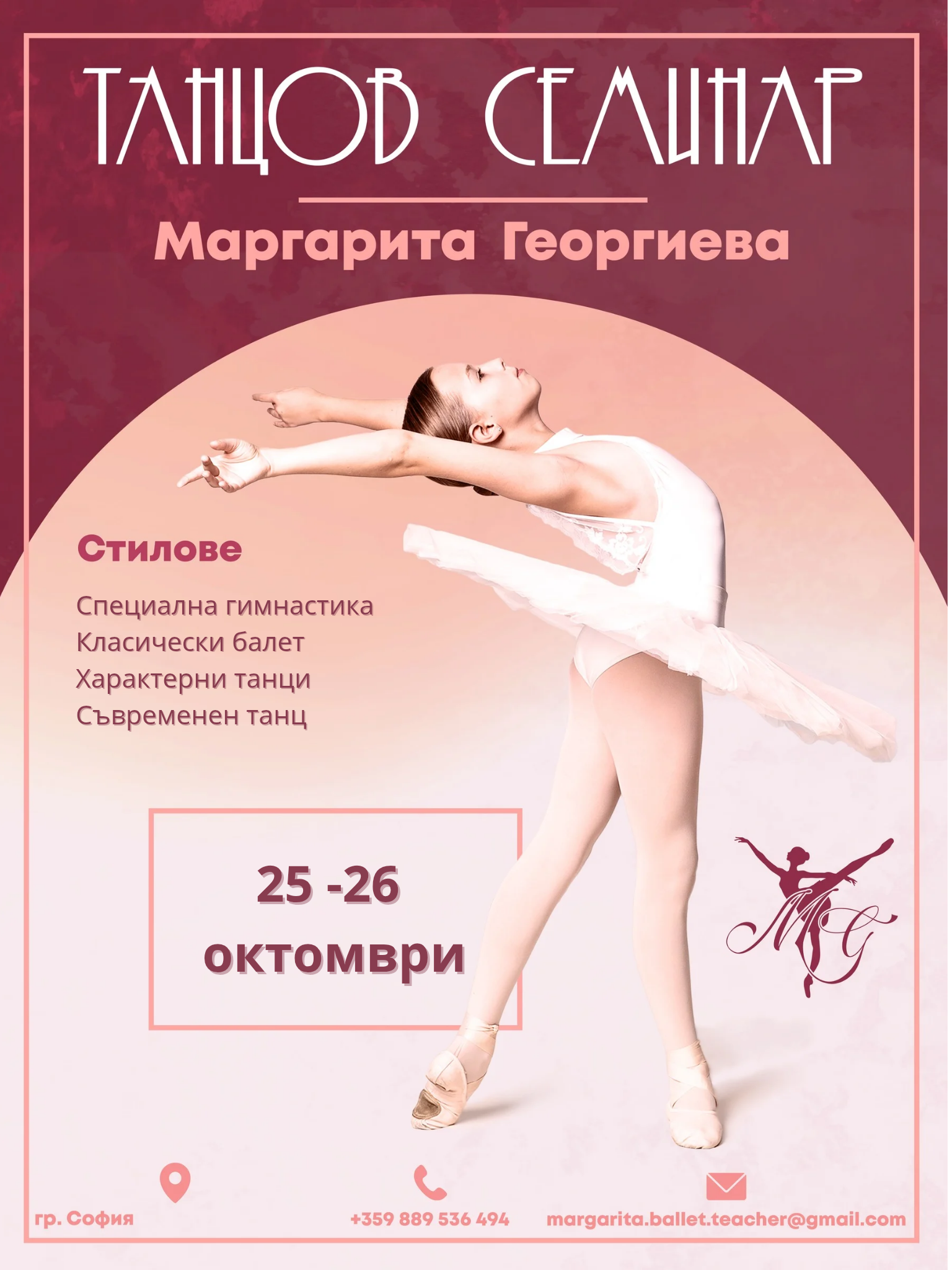 На 25 и 26 октомври предстои танцов семинар с класове по класически балет, характерен и съвременен танц, и специална гимнастика. За първи път гост-преподаватели ще бъдат Валерия Обретенова и Бетина Димитрова.